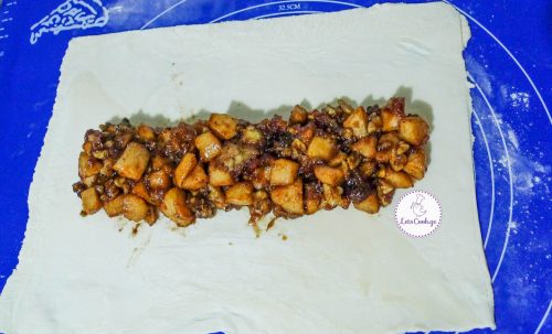 - Roll the puff pastry on a floured board to 3-4 mm thickness, and spread the cooled filling in the middle of the dough, as shown in the photo.