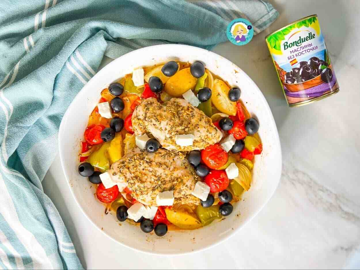 Place 2 cm thick diced bell peppers, diced onions, lemon slices, and cherry tomatoes in a baking dish. In a separate bowl mix finely chopped garlic, olive oil, paprika, and oregano. Pour a third of the sauce over the vegetables. Season with salt and pepper and mix well to spread the sauce evenly over the vegetables. Put the pieces of chicken fillet on the vegetables, and pour with the remaining sauce. Put it in an oven heated to 200°C and bake for 25 minutes. After 25 minutes, remove, and add olives and feta. Bake again for 5-10 minutes.Bon Appetit!