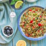 - Finely chop the onion and garlic, cut the carrot and bulgar into thin and long pieces, and cut the Brussels sprouts lengthwise.