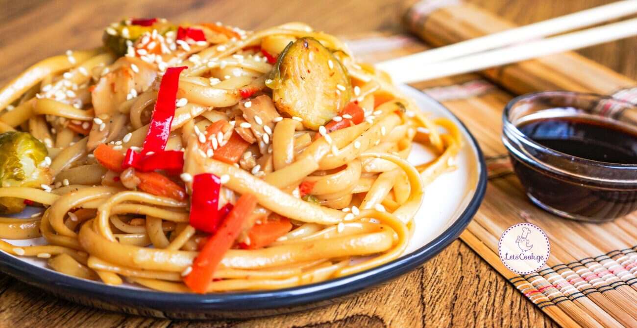 Pasta with vegetables, soy sauce, and sesame seeds